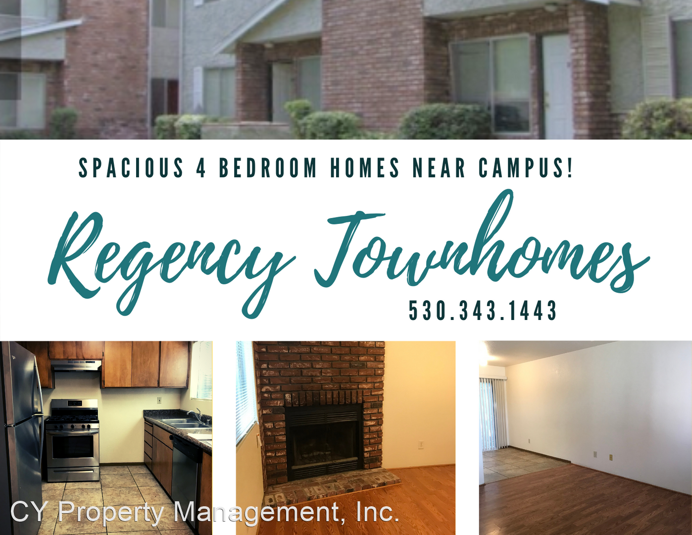 Spacious & Affordable 4 Bedrooms - Close to Campus!! - **Limited Special** Apply and sign a lease by May 31st and pay only $1895, normally $2,100. Mention this add to get this fantastic rate on your 4 bedroom townhome for next year. Regency Townhomes Spacious & Affordable 4 Bedrooms - Close to Campus!! NOW LEASING FOR THE '23/'24 SCHOOL YEAR! Come home to the BEST KEPT SECRET of college housing-- Regency Townhomes! Are you looking for a spacious 4 bedroom apartment close to campus and shopping? Grab some friends and check out Regency Townhouses! Regency Townhomes are the perfect complex that YOU HAVE BEEN SEARCHING FOR! We are a quiet community right next to campus. Skip the frustration of feeling boxed in as our floorplan is SPACIOUS and GENEROUS for you and your roomies! Skip the laundromat as our modern apartment has IN UNIT WASHER AND DRYER! Skip the LONG DRIVES to the grocery store, coffee shop, and gas stations as they are within minutes from our sweet little complex. Every Unit includes: * Washer and Dryer * A large kitchen space with plenty of cabinet space * A cozy fireplace * Central heating and air * Ceiling fans in each room * Double vanity bathroom Plus you'll LOVE these extra amenities! PET AREA/DOG RUN, BASKETBALL COURT, COURTYARD, BBQ'S!! Rental Terms: Rent: $1,895.00 Application Fee: $30.00 *Renters Insurance Required* Office: 530-433-1513 Apply at: https://www.cypm.net/vacancies/