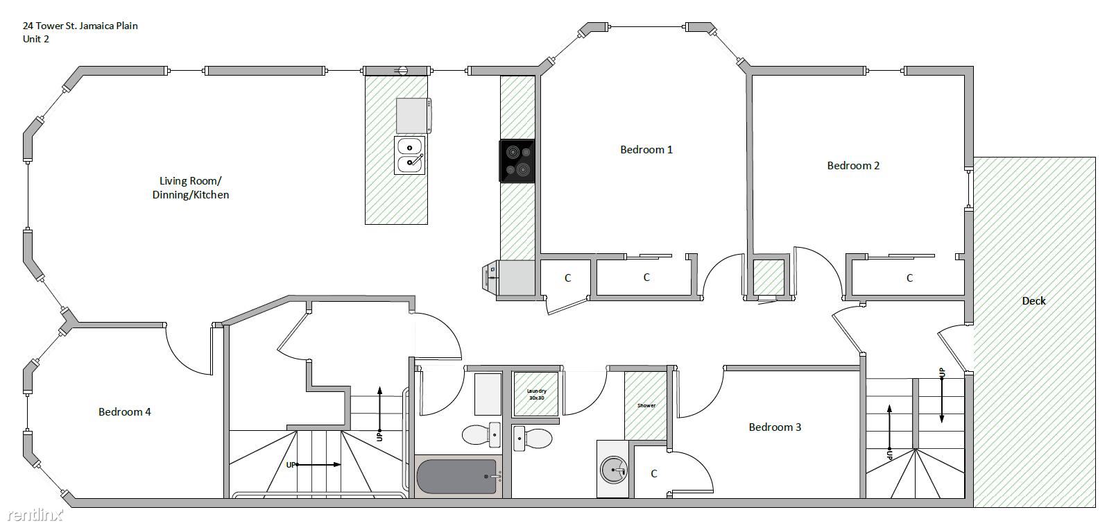 STUNNING 4 bed, 2 bath apartment in Jamaica Plain just a 1 minute walk to the Forrest Hills Orange Line stop with a parking spot included! Apartment was just totally redone with high-end, condo quality finishes such as QUARTZ counters and BRAND NEW stainless steel appliances including dishwasher/disposal and WASHER/DRYER IN UNIT. Hardwood floors throughout and generous room sizes. Brand new energy efficient heater with central A/C. Apartment features a private deck and private basement storage for your unit. This is a big step up from your normal rental finishes, and might possibly be the nicest 4 bed available for rent in Jamaica Plain.