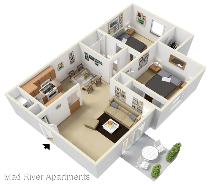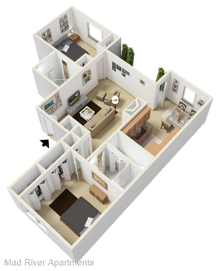 The Riverside - Roomy two bedroom, two bath with ample closet space and full sized washer & dryer. The living room flows perfectly into the dining room, making this spacious two bedroom layout ideal for entertaining. Vaulted Ceilings* Walk-In Closets* Fireplaces* Washer/Dryer Cable Ready *In Select Units