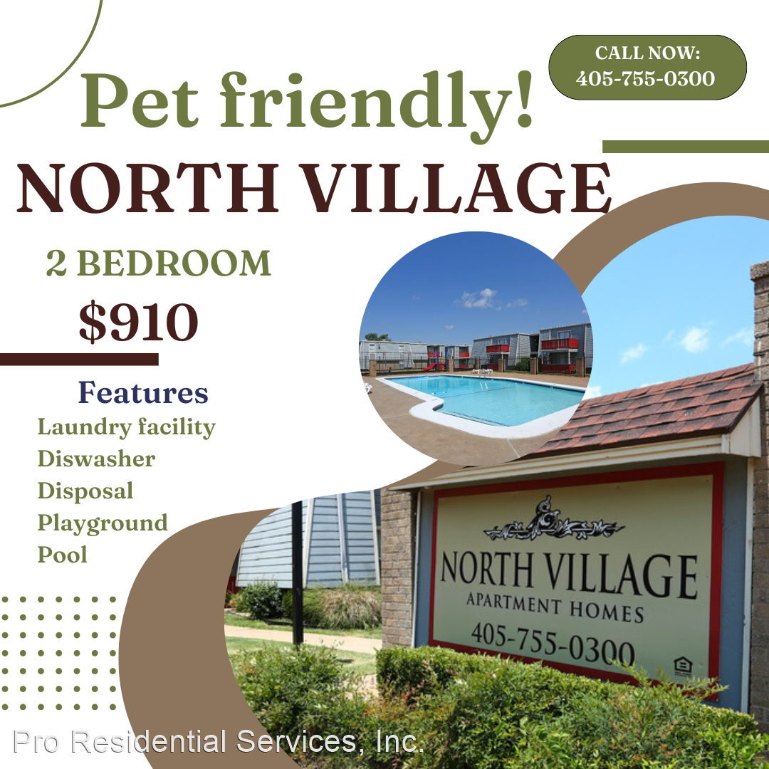 50% OFF First month rent! (o.a.c) - Welcome Home to these wonderful Oklahoma City Apartments! With our caring, professional staff that’s sure to make you feel at home, coupled with the great new feel of North Village Apartments, you won’t want to look anywhere else! Our Apartments In Oklahoma City include new ceramic tile and carpet, designer light fixtures, and a great playground, just to name a few! With beautiful mature landscaping, a fun playground area, and a convenient location, you’re sure to love North Village Apartments! Now there is a better way to live, work, and play in the heart of Oklahoma City. Our Apartments In Oklahoma City are distinctively styled with the features and amenities we know you will love. Strategically designed, these generous spaces feature large closets, individual climate control and tasteful design features tailored to comfort living. Best of all, our generous management team is committed to making your experience enjoyable. Finally, an apartment home that provides space to feel inspired. Welcome home to your new Oklahoma City Apartment. North Village Apartments is an apartment community located in Oklahoma County and the 73114 ZIP Code. This area is served by the Oklahoma City Public Schools attendance zone. (405)755-0300 Requirements *Picture ID *Income verification (Minimum one month proof of income) *Rental Verification Hablamos espa&ol