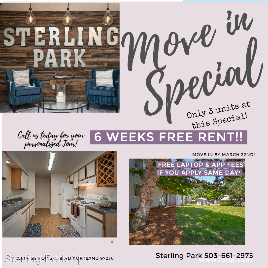 $1000 off July & Aug Rents!Large 2BR 2BTH With Ample Storage, Pool and More! - Welcome to Sterling Park Apartments & Your new home!! We have LARGE 2 bdrm 2 bath apartments available now!! Call us TODAY for details and schedule a tour! Apply online at: https://www.thesterlingparkapts.com/ Each of our units comes with the perfect Wood-Burning Fireplace, Galley style kitchen, with breakfast bar for entertaining, great spaced living room, your own patio, full size washer and dryer, a parking space that's all yours, sparkling swimming pool and spa, beautiful clubhouse and lots more! Call us today to set up a tour at 503-661-2975 We are open from 10am-6 pm, Monday to Friday. Community Amenities: -Sparkling Seasonal Swimming Pool -Seasonal Spa -Clubhouse -Easy access to freeway, public transportation, and shopping -Assigned parking spot -Pet-friendly, (breed restricted) -On-line rent payments and resident services -On-site maintenance -Professional Onsite Community Management team Apartment Features: -Wood-Burning Fireplace -Expansive Living room area -Galley style kitchen -Breakfast bar -Separate Dining area -Balconies/patio w/storage -Full size Washer/Dryer -Walk in Shower in Master bdrm -Updated appliances & lighting -Lots of closets for indoor storage What are the other costs? $55 application fee pays for the screening. $500 Security deposit OAC- Up to one months rent depending on credit $65 Monthly Pet Rent Monthly water/sewer/trash based on usage Give us a call if you have any questions at 503-661-2975 We are open from 9am-5:30pm, Monday to Friday. Our community office is located at: 16804 SE Powell Blvd Portland, OR, 97236 Southeast Portland, pool, spa, clubhouse, swimming pool, covered parking, carport, 2 bedroom, 2 bedroom, w/d, new appliances, upgrade, SE Portland, Near Gresham, near shopping, near bus lines, near transit, near bus lines, private balcony, Pet friendly, dog park. Large living room, large bathroom, onsite staff