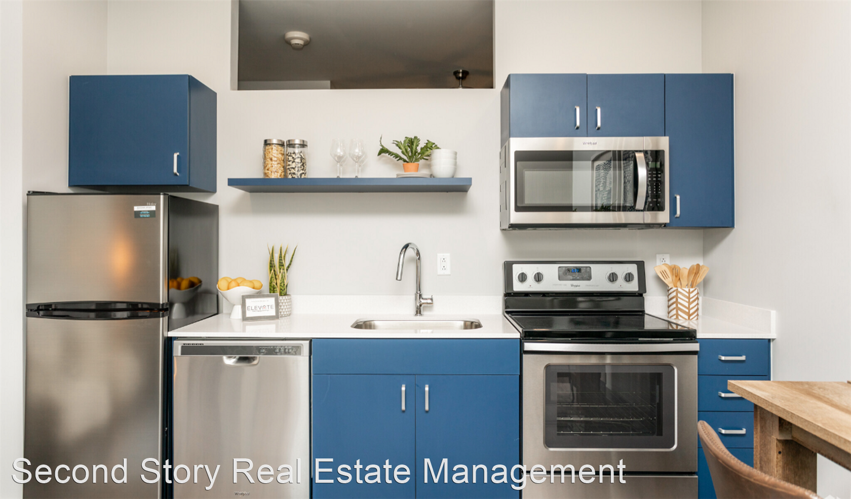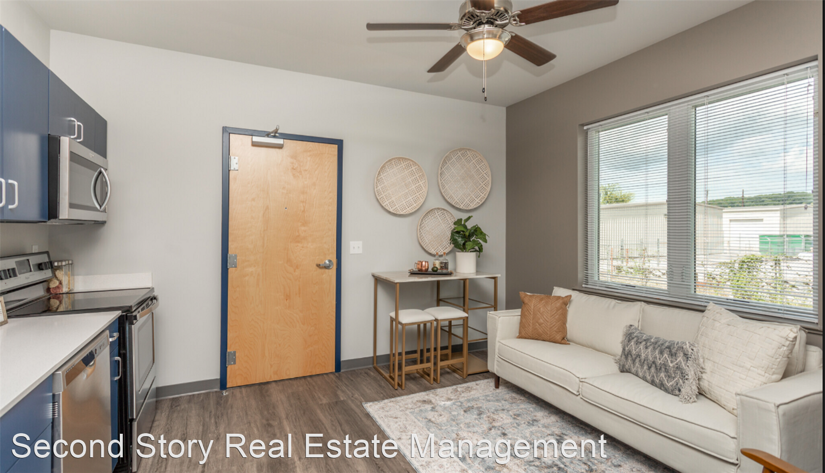 The units have stainless steel appliances, quartz countertops, W/D in unit, wood laminate flooring, accent walls, large windows, central heat/air, contemporary royal blue cabinetry, and includes off-street parking!